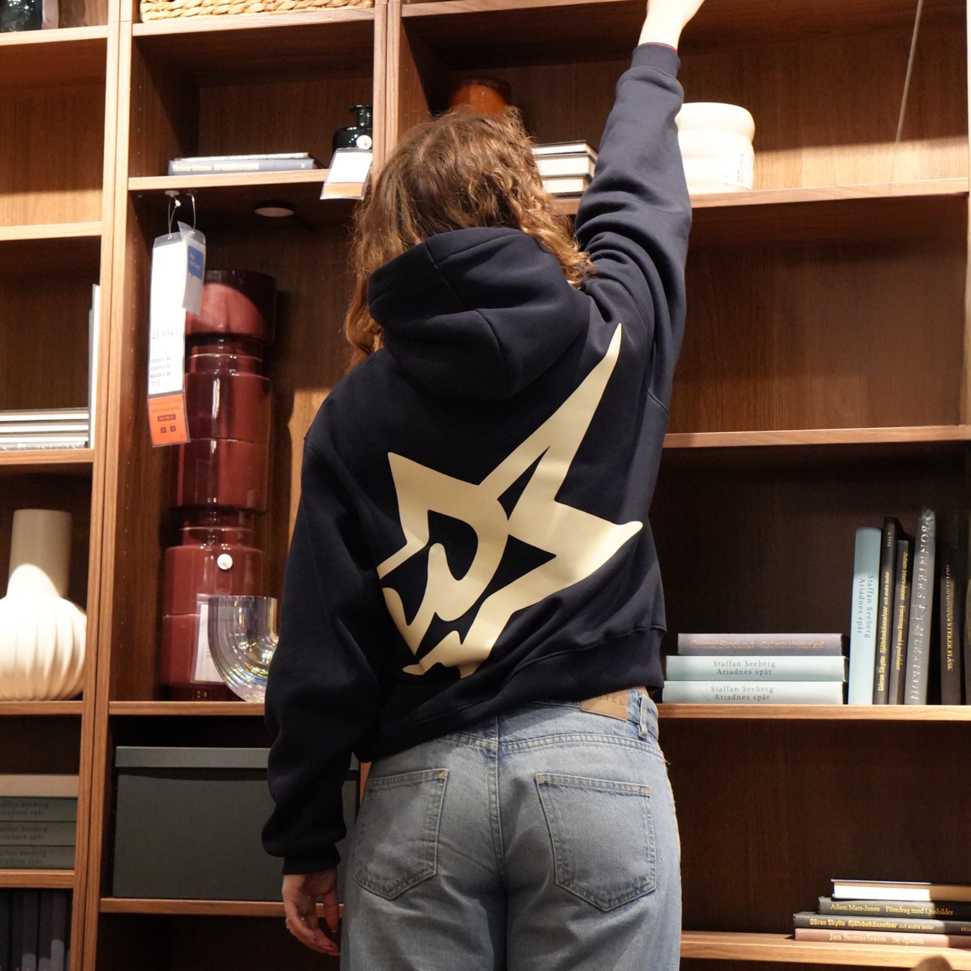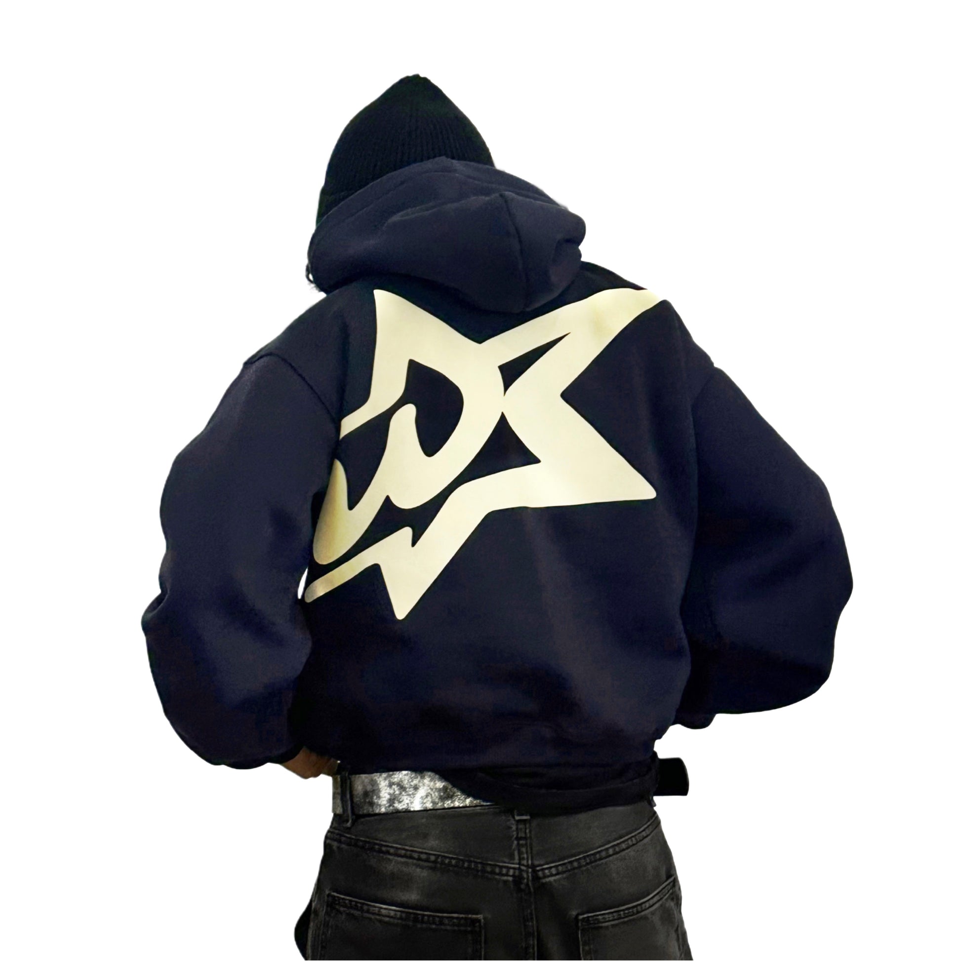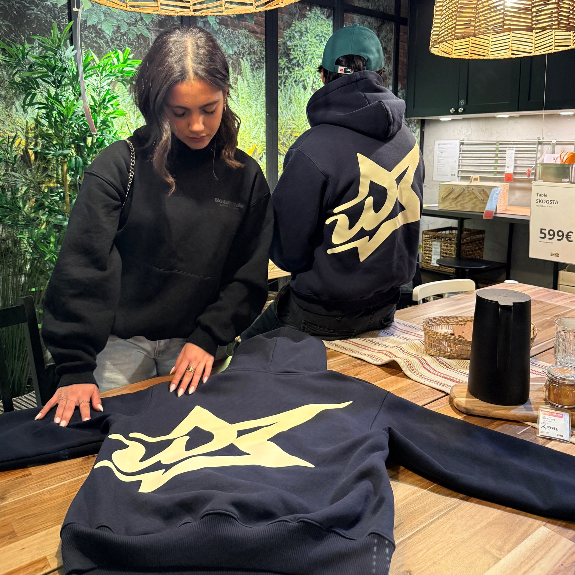 The WWD Hoodie (Midnight) is made from a premium Italian cotton blend. Designed with a boxy, relaxed fit, dropped shoulders, wide sleeves, and structured tight hems. Finished with a double-layered hood, ribbed cuffs, and tonal stitching for a clean silhouette. Made in deep midnight blue fabric with cream prints, bringing bold style with a refined edge.