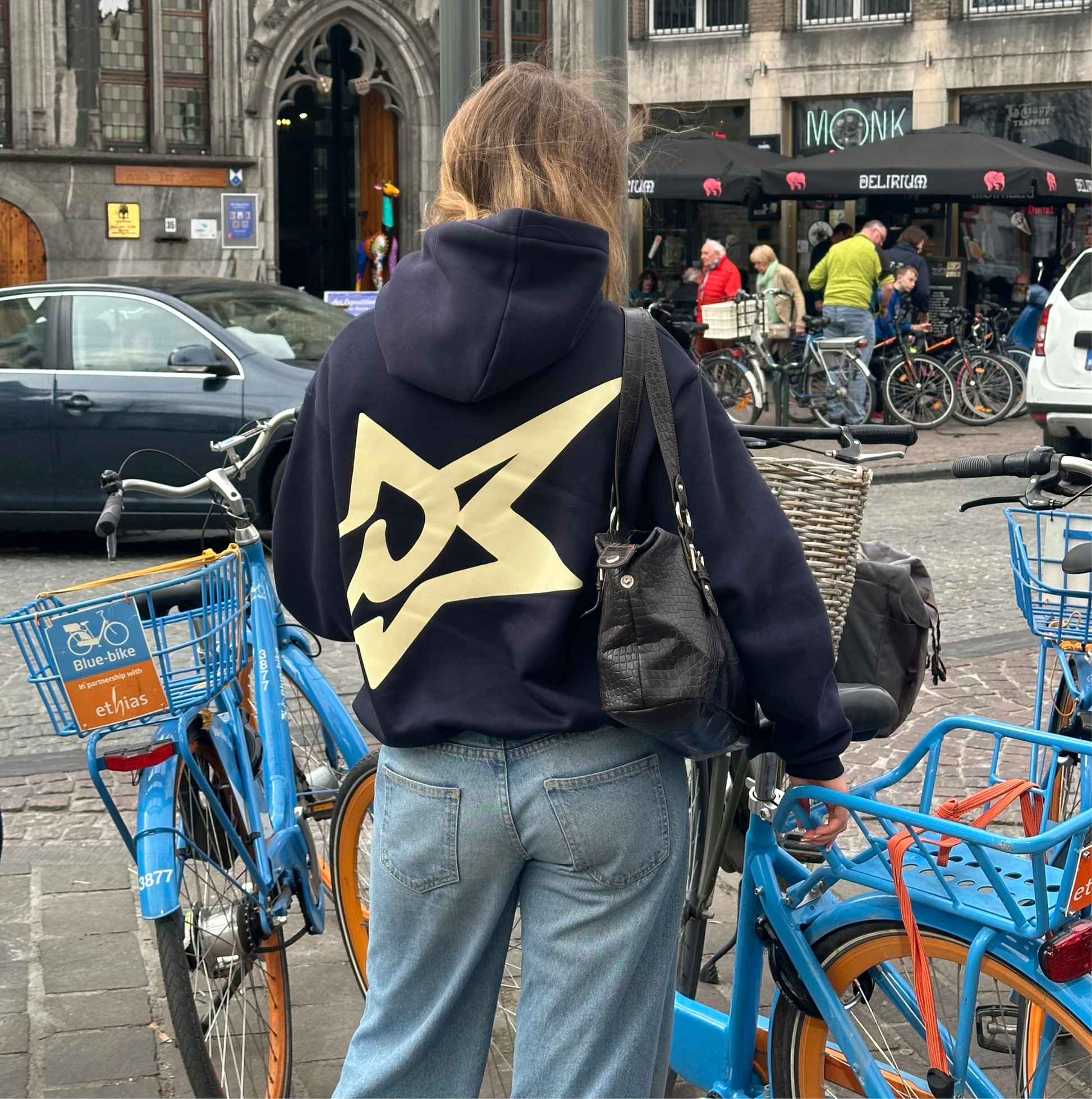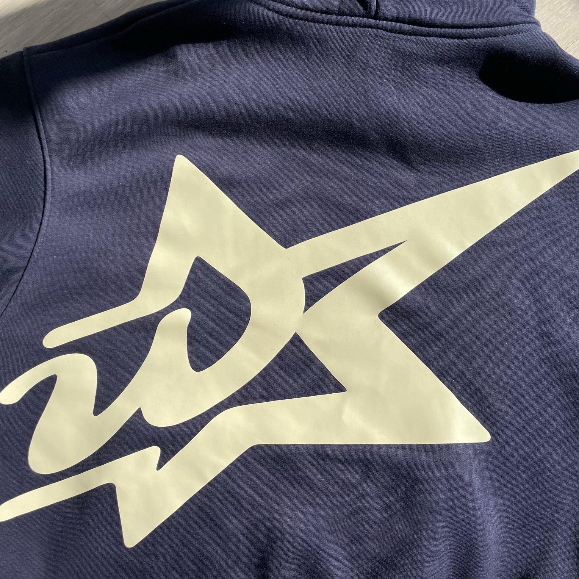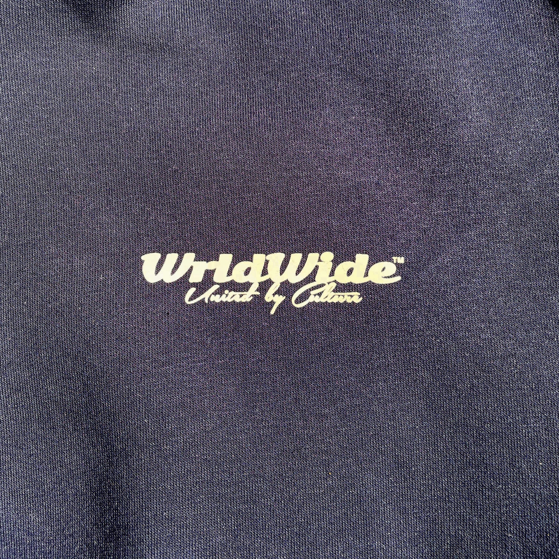 The WWD Hoodie (Midnight) is made from a premium Italian cotton blend. Designed with a boxy, relaxed fit, dropped shoulders, wide sleeves, and structured tight hems. Finished with a double-layered hood, ribbed cuffs, and tonal stitching for a clean silhouette. Made in deep midnight blue fabric with cream prints, bringing bold style with a refined edge.